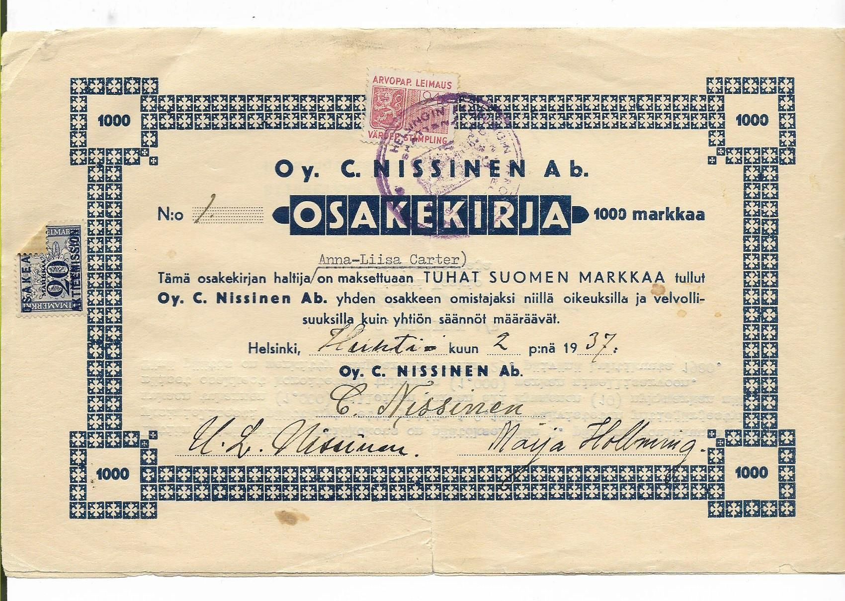 16. OY C.NISSINEN AB – on myös myytävänä – yhden henkilön hallitus. Saa harjoittaa vähittäiskauppaa ja tukkukauppa – ei rajoituksia. 25x1000 mk:n osakkeita. Perusttu 6.4.-37. Ly 0196236-7. Huutomyynti.fi.